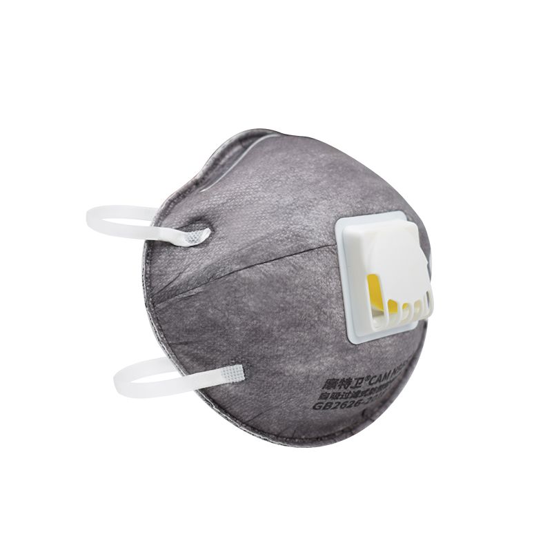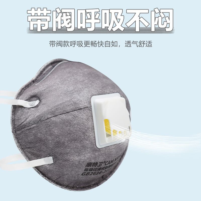 主要由口罩体、鼻夹、口罩带。口罩体材料为五层,从外至内依次为:聚丙烯纺粘无纺布、聚丙烯熔喷无纺布、碳布、聚丙烯熔喷无纺布、针刺棉。鼻夹为可弯折可定型材料,口罩带为弹性材料,头戴,分无阀和有阀。