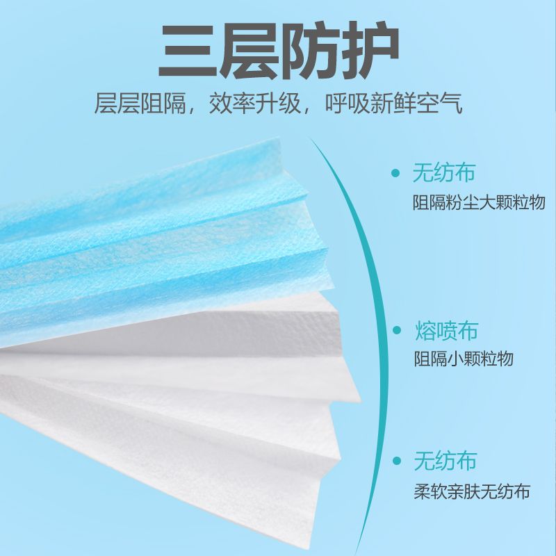 主要由口罩体、鼻夹、口罩带。口罩体材料从外至内依次为:聚丙烯纺粘无纺布、聚丙烯熔喷无纺布、聚丙烯纺粘无纺布。鼻夹为可弯折可定型材料,口罩带为弹性材料。