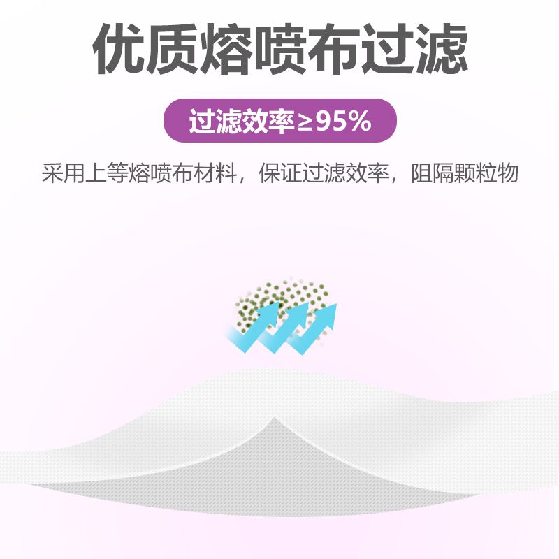 主要由口罩体、鼻夹、口罩带。口罩体材料从外至内依次为:聚丙烯纺粘无纺布、聚丙烯熔喷无纺布、聚丙烯纺粘无纺布。鼻夹为可弯折可定型材料,口罩带为弹性材料。
