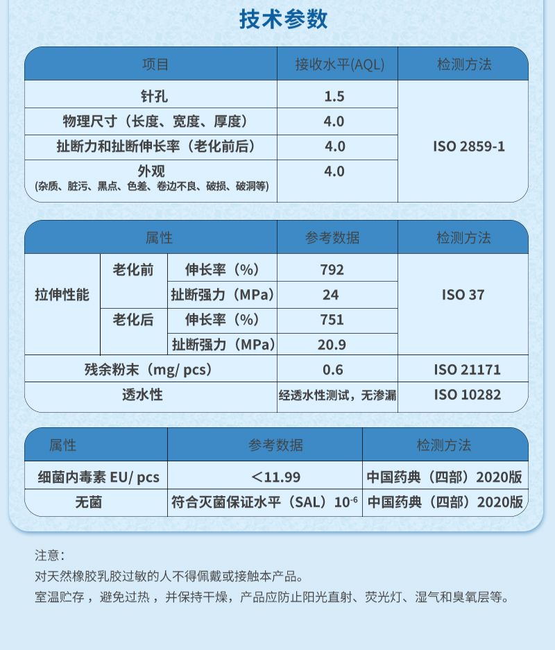 - **性能特点** - **灭菌处理**:产品经辐照或环氧乙烷灭菌,灭菌水平达到SAL10-6,符合相关标准,确保手套无菌。 - **独立包装**:每双均为独立包装,有效避免二次污染,方便取用和保存,装箱规格一般为50双/包,4包/箱。