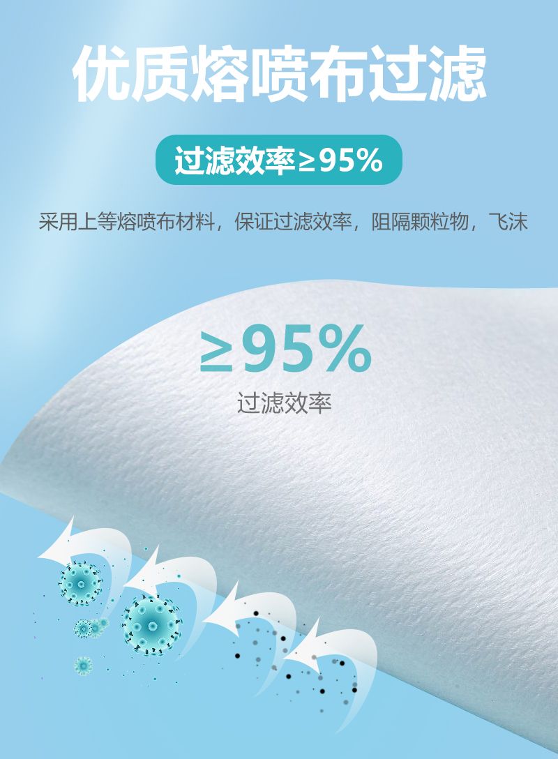 ES哑光无纺布、聚丙烯熔喷无纺布、ES哑光无纺布。鼻夹为可弯折可定型材料,口罩带为弹性材料。