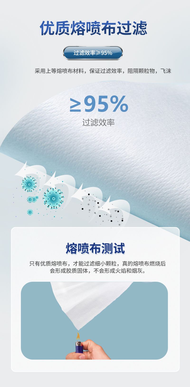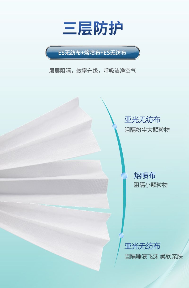 ES哑光无纺布、聚丙烯熔喷无纺布、ES哑光无纺布。鼻夹为可弯折可定型材料,口罩带为弹性材料。