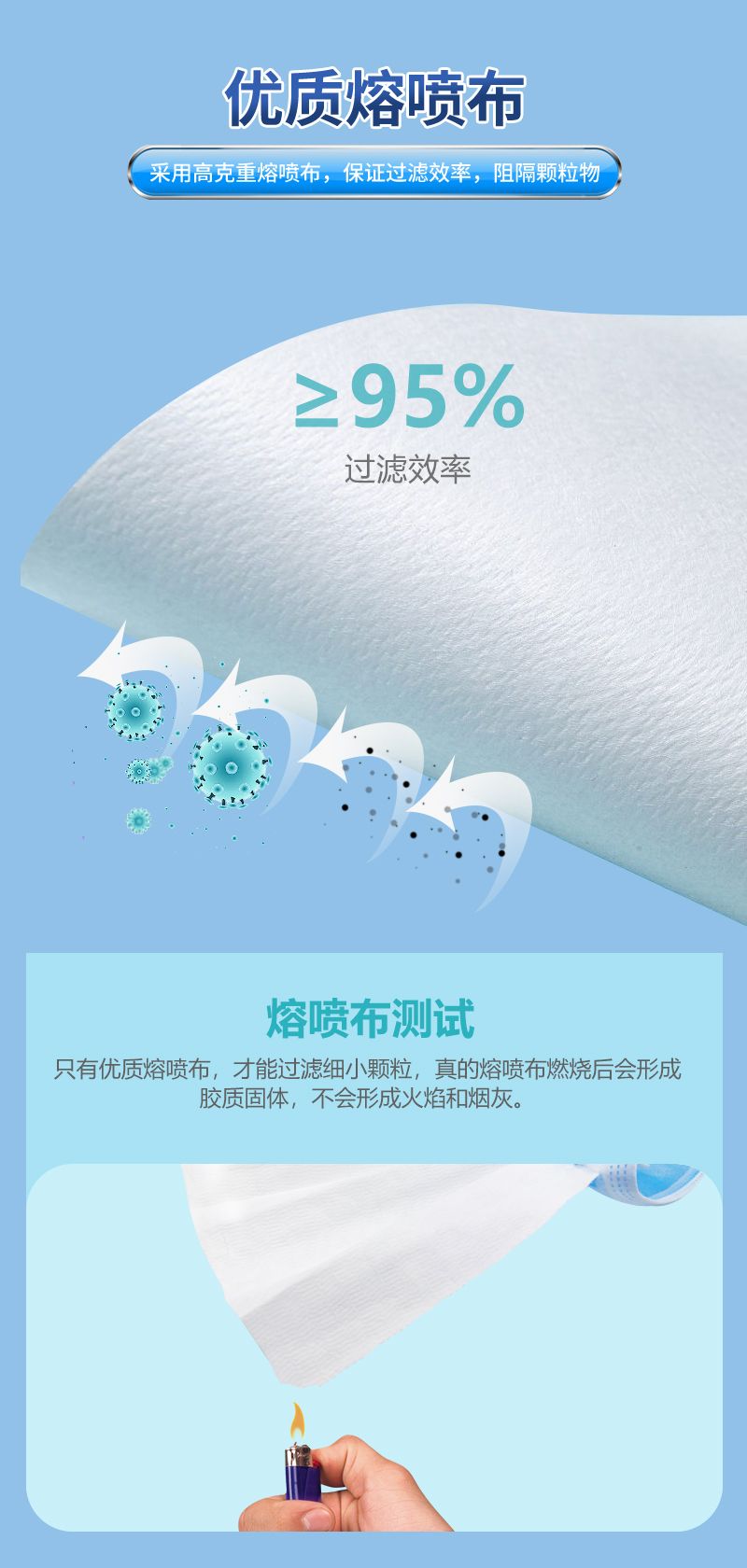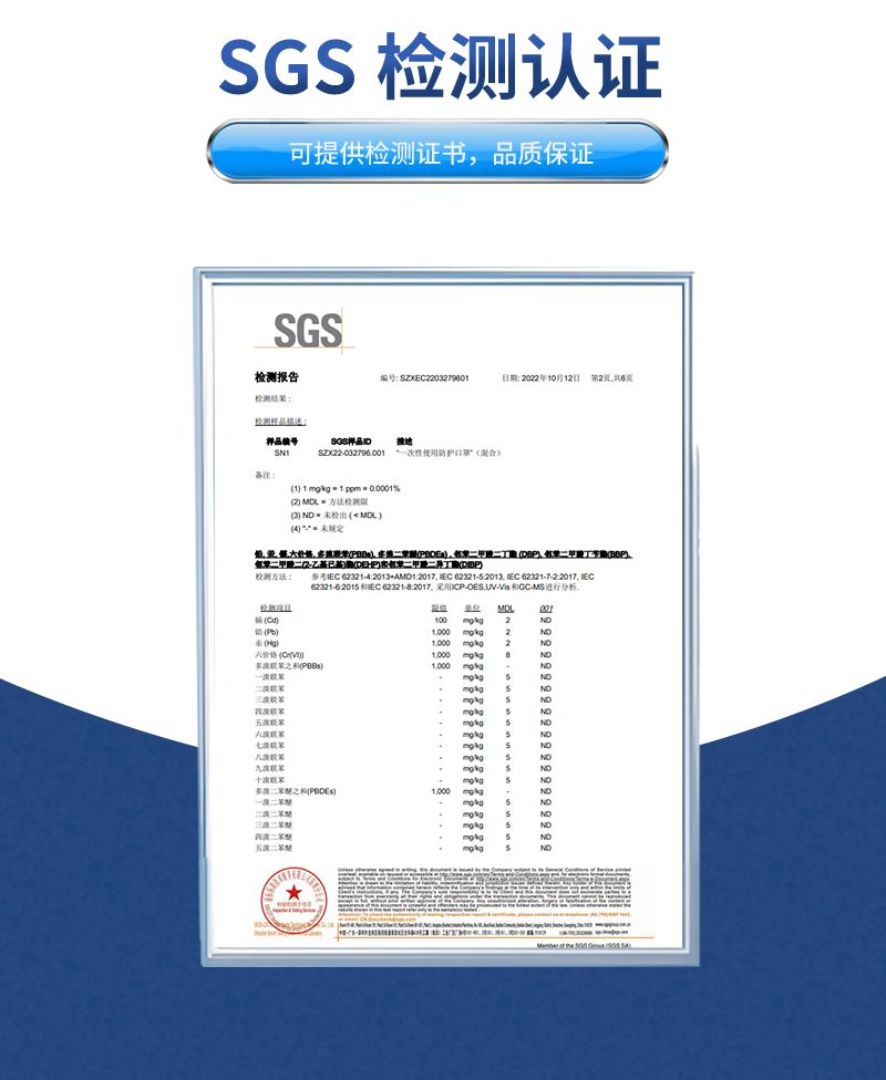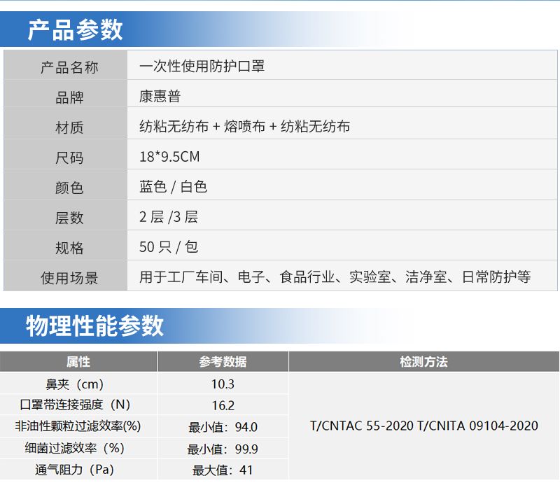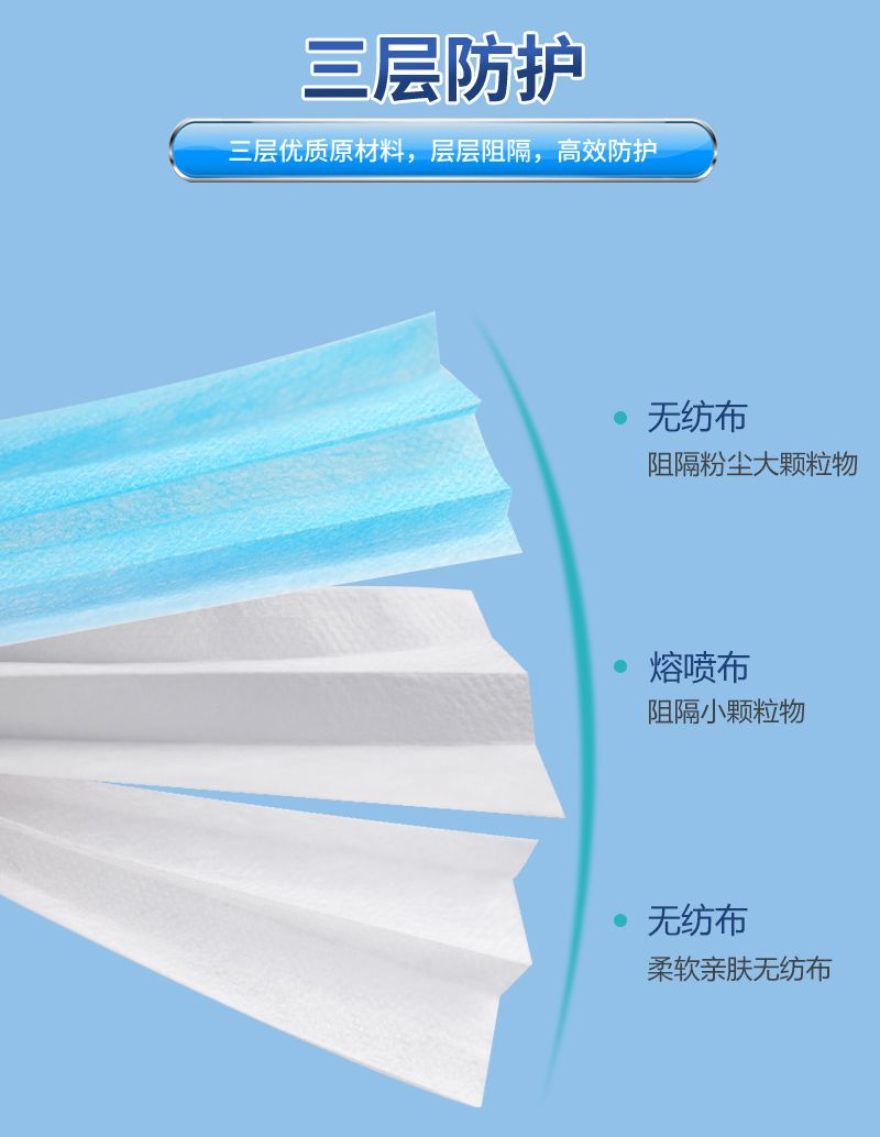 主要由口罩体、鼻夹、口罩带。口罩体材料从外至内依次为:聚丙烯纺粘无纺布、聚丙烯熔喷无纺布、聚丙烯纺粘无纺布。鼻夹为可弯折可定型材料,口罩带为弹性材料。