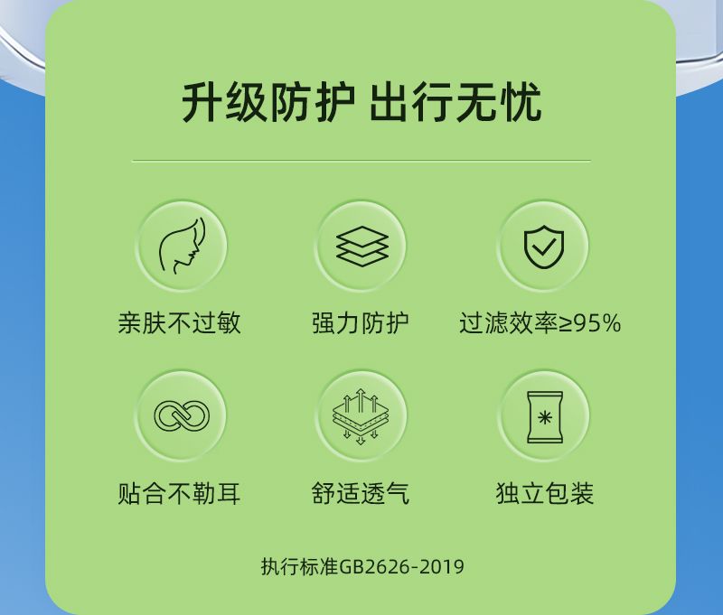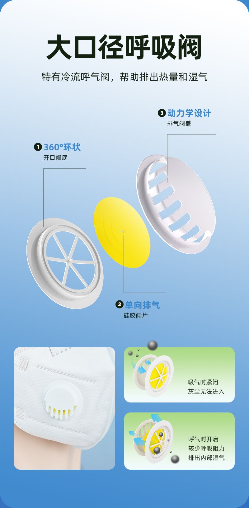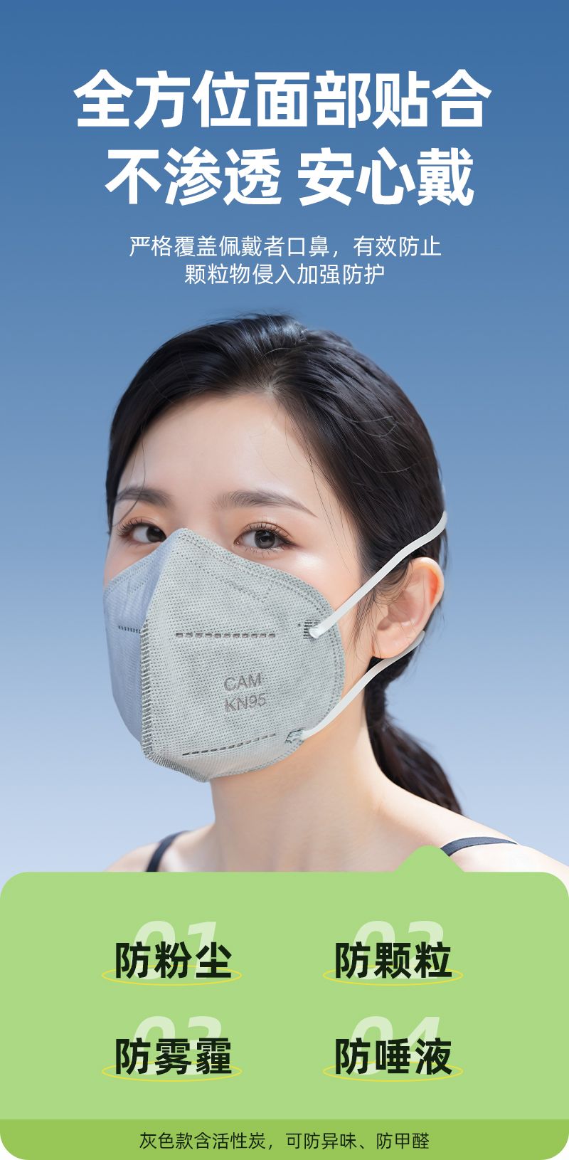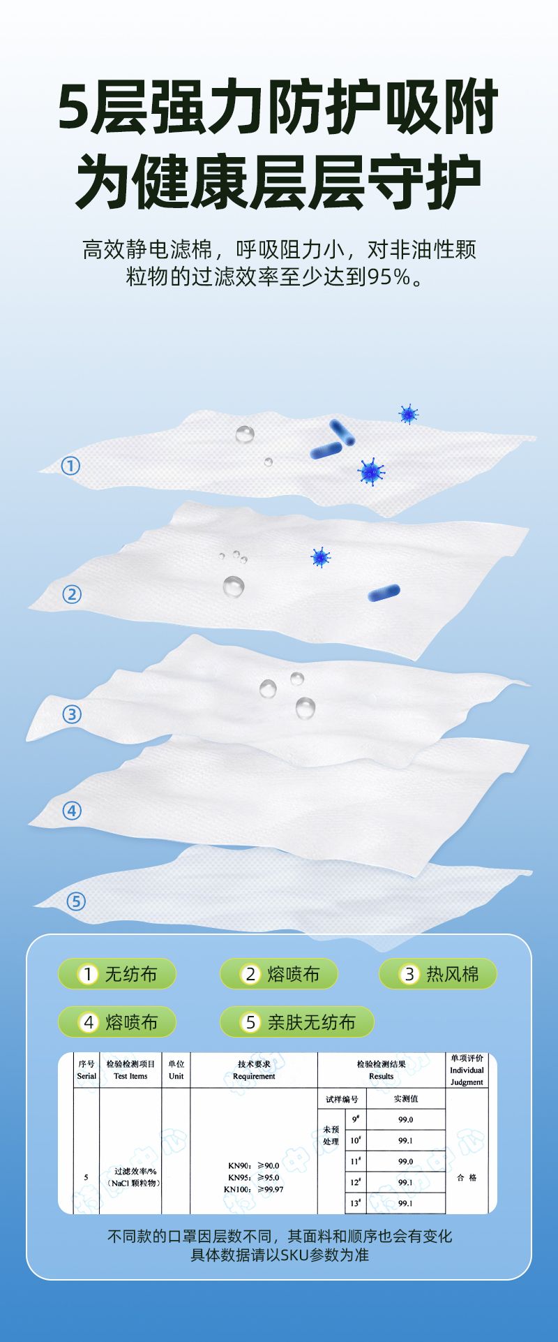 - 防护性能高:采用五层复合滤材,外层为防静电无纺布,可阻隔大颗粒及飞溅物,防静电设计避免吸附粉尘;中间是双重熔喷布层,运用静电驻极技术,能捕捉 0.3μm 颗粒物,过滤效率≥95%;内层为抑菌亲肤层,可降低呼吸潮湿感,抑制细菌滋生,适合敏感肌使用。