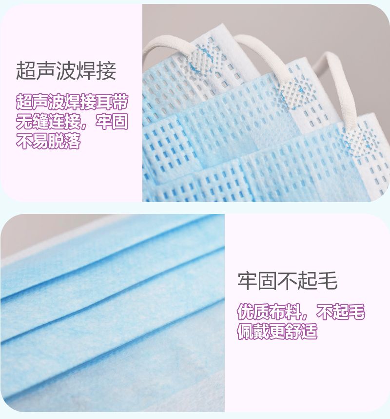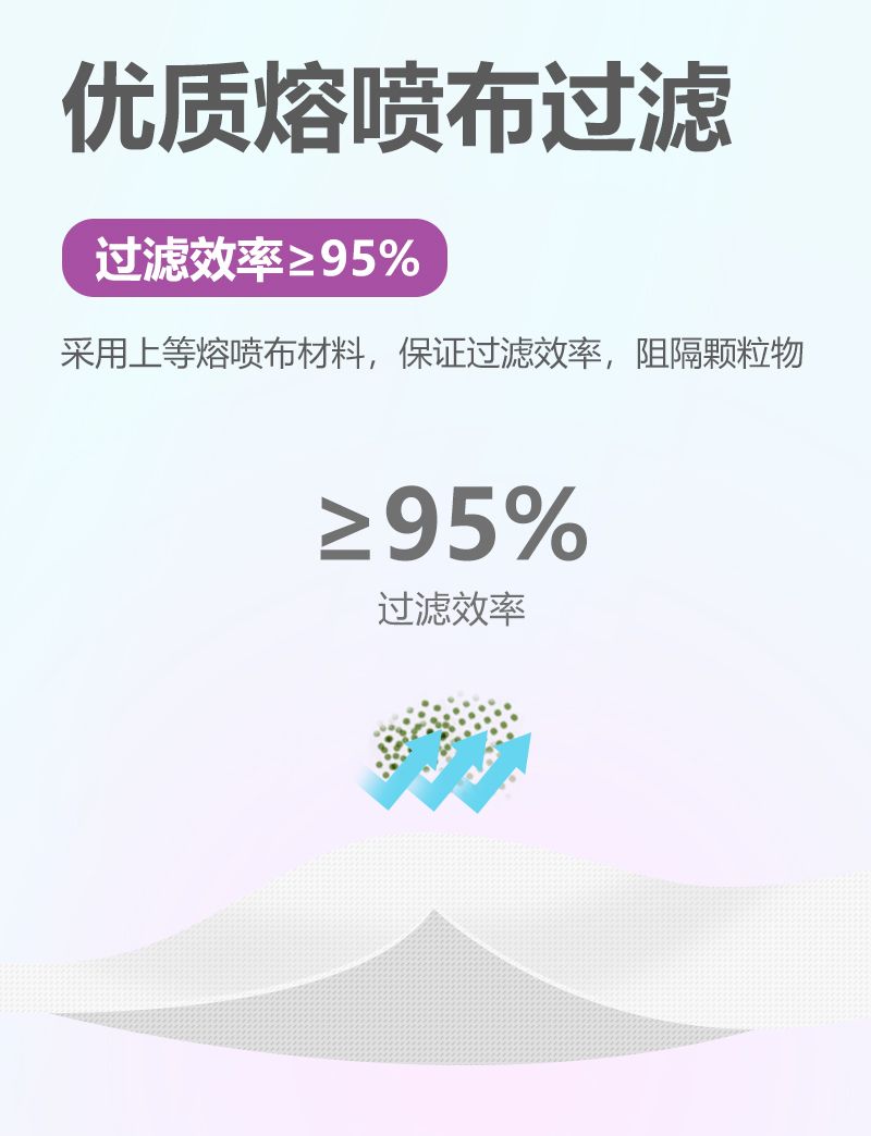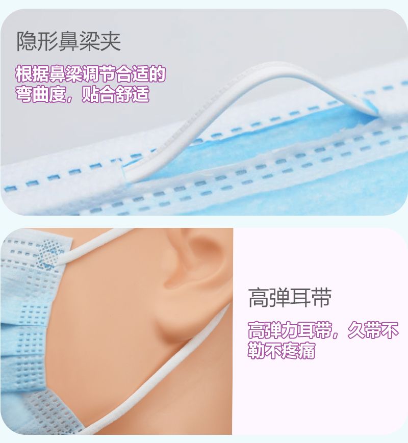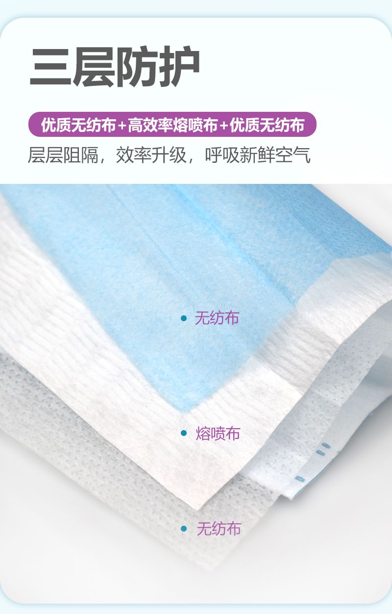 主要由口罩体、鼻夹、口罩带。口罩体材料从外至内依次为:聚丙烯纺粘无纺布、聚丙烯熔喷无纺布、聚丙烯纺粘无纺布。鼻夹为可弯折可定型材料,口罩带为弹性材料。