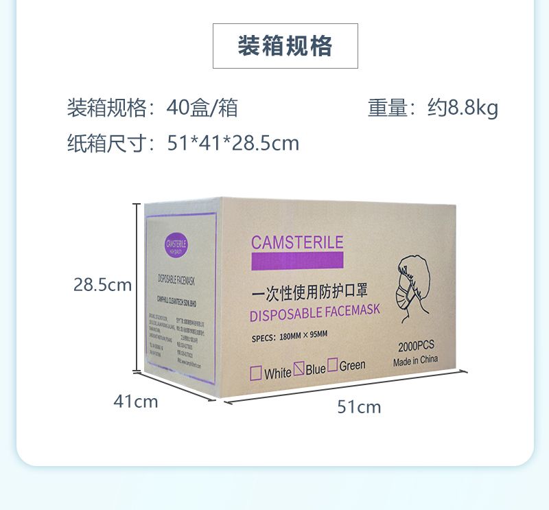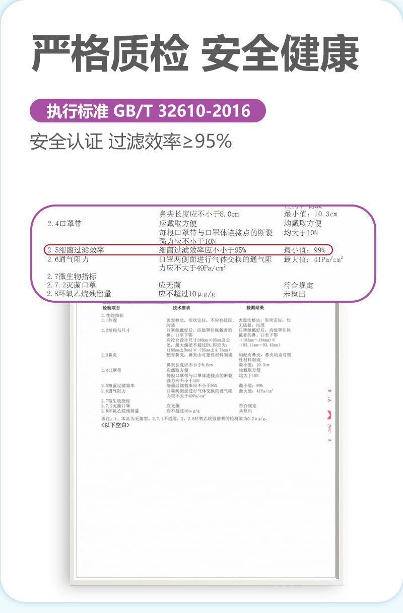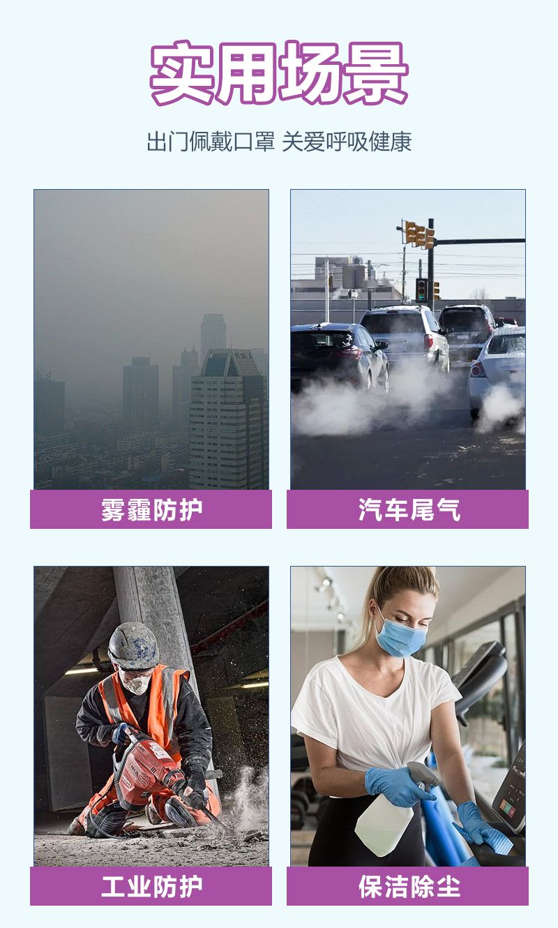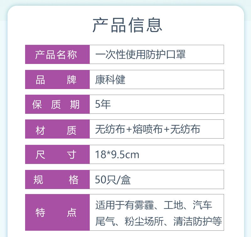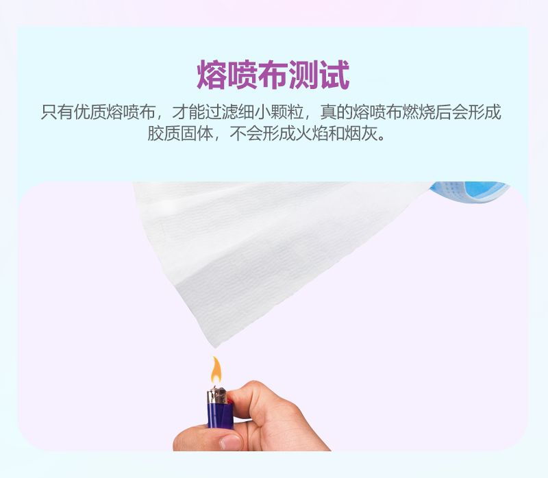 主要由口罩体、鼻夹、口罩带。口罩体材料从外至内依次为:聚丙烯纺粘无纺布、聚丙烯熔喷无纺布、聚丙烯纺粘无纺布。鼻夹为可弯折可定型材料,口罩带为弹性材料。