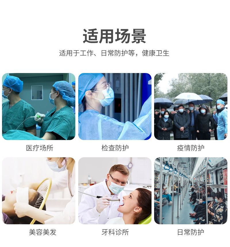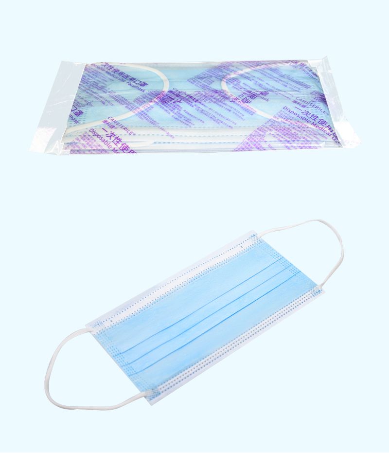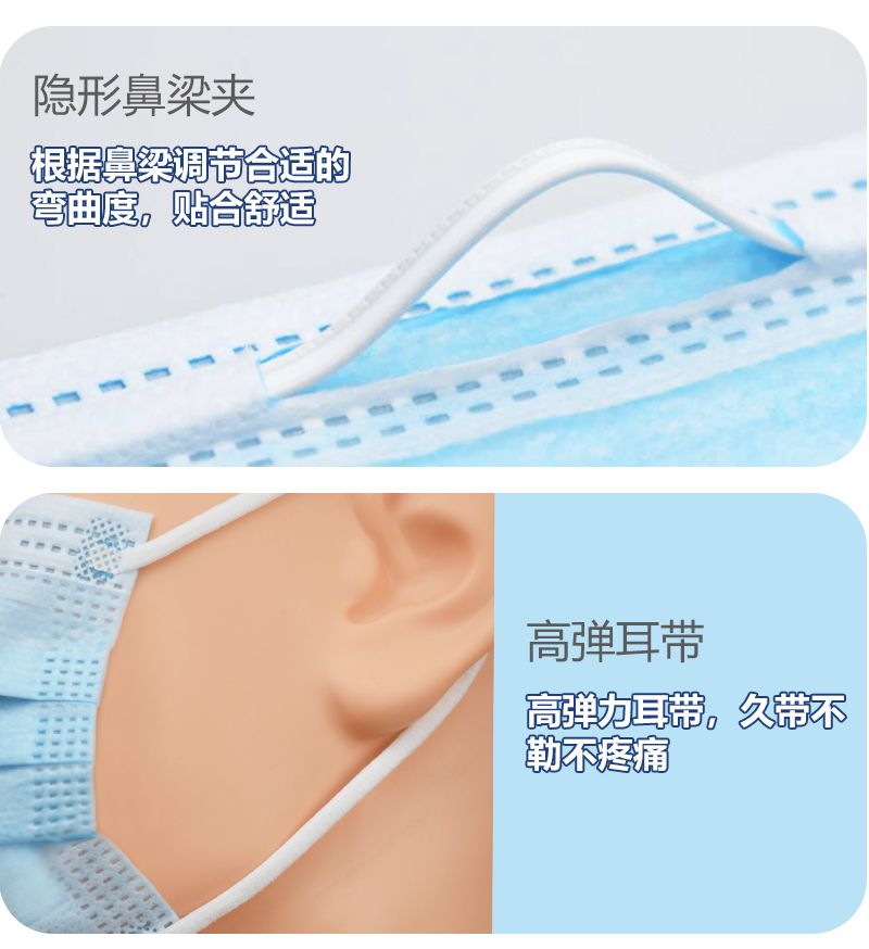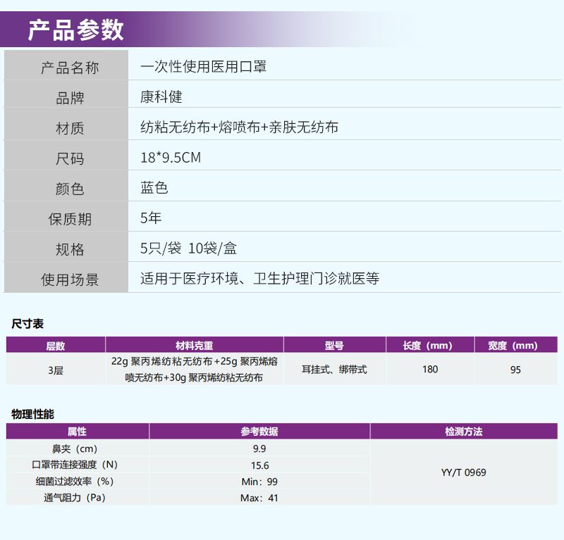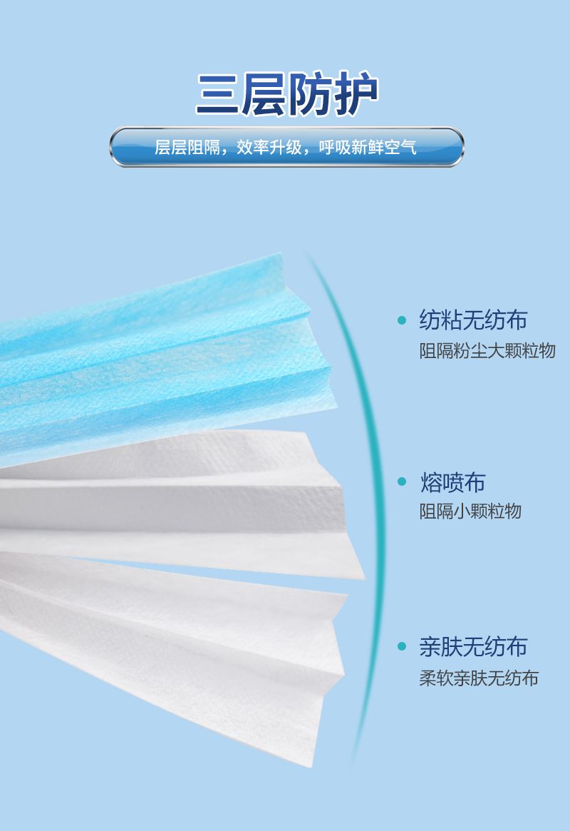 一次性使用医用口罩由口罩体、鼻夹、口罩带组成。口罩体分内、中、外三层,内层为聚丙烯纺粘无纺布,中层为聚丙烯熔喷无纺布,外层为聚丙烯纺粘无纺布。鼻夹为可弯折可定型的铝塑条。耳挂式口罩带由弹性材料制成,绑带式口罩带由无纺布制成。产品包括无菌型和非无菌型,其中无菌型经环氧乙烷灭菌,