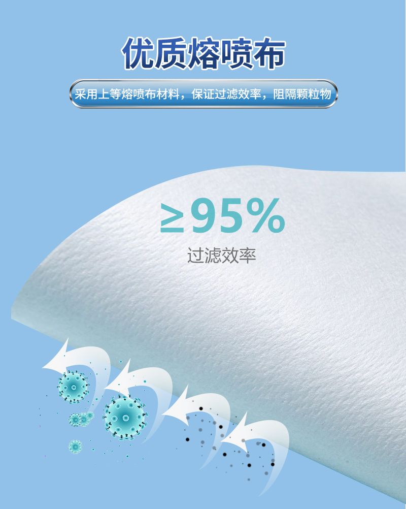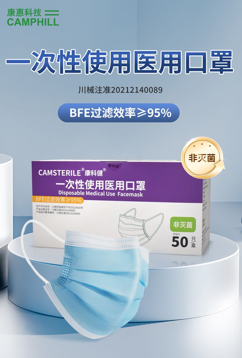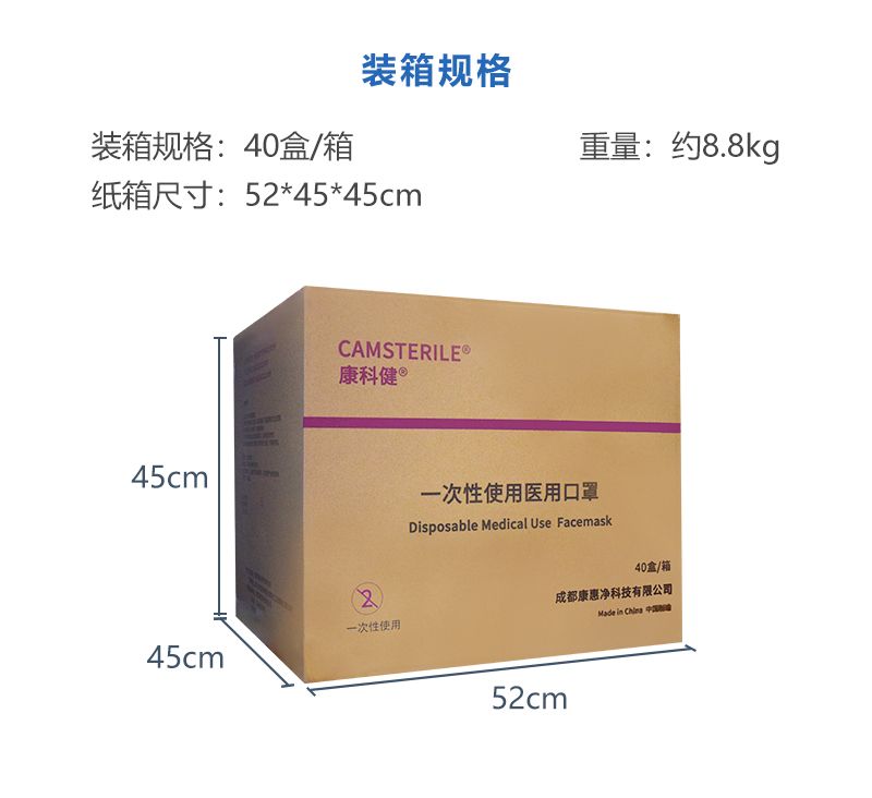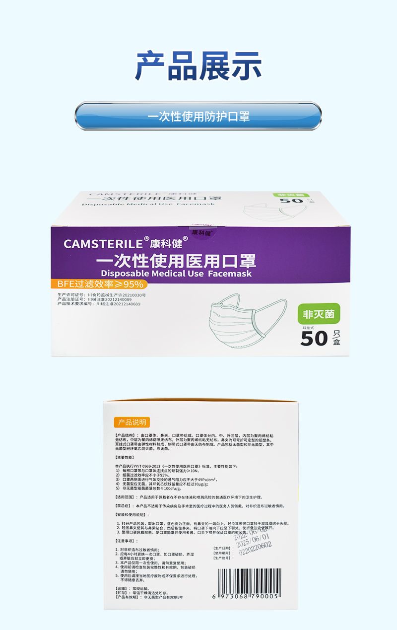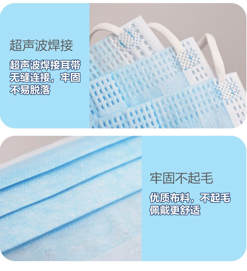 一次性使用医用口罩由口罩体、鼻夹、口罩带组成。口罩体分内、中、外三层,内层为聚丙烯纺粘无纺布,中层为聚丙烯熔喷无纺布,外层为聚丙烯纺粘无纺布。鼻夹为可弯折可定型的铝塑条。耳挂式口罩带由弹性材料制成,绑带式口罩带由无纺布制成。产品包括无菌型和非无菌型,其中无菌型经环氧乙烷灭菌,