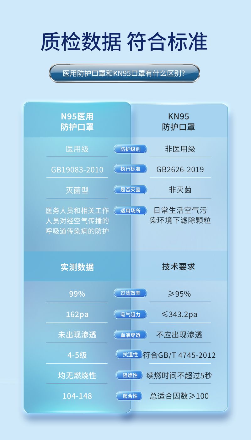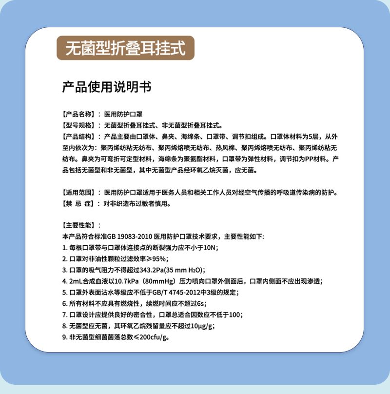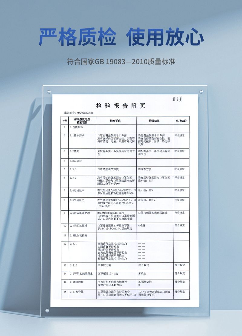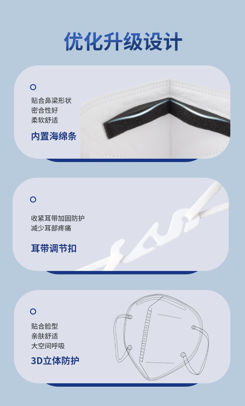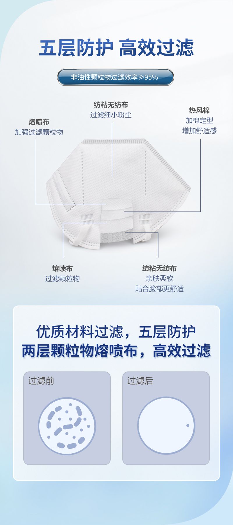 :采用无纺布、熔喷布、热风棉等材料制作,能过滤包括 PM2.5、花粉、尘埃等微小颗粒物,过滤效率达到 95%(非油性颗粒物),满足 GB2626-2019 标准。