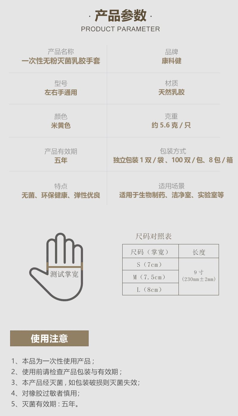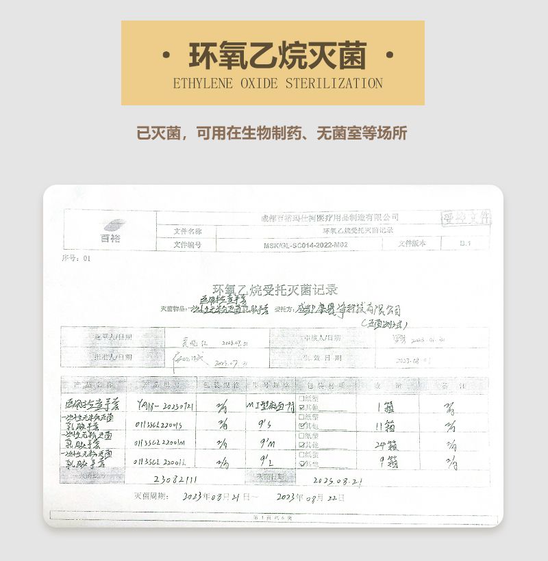 - 灭菌方式:采用环氧乙烷灭菌,确保手套达到无菌标准,适合在对卫生要求极高的环境中使用。